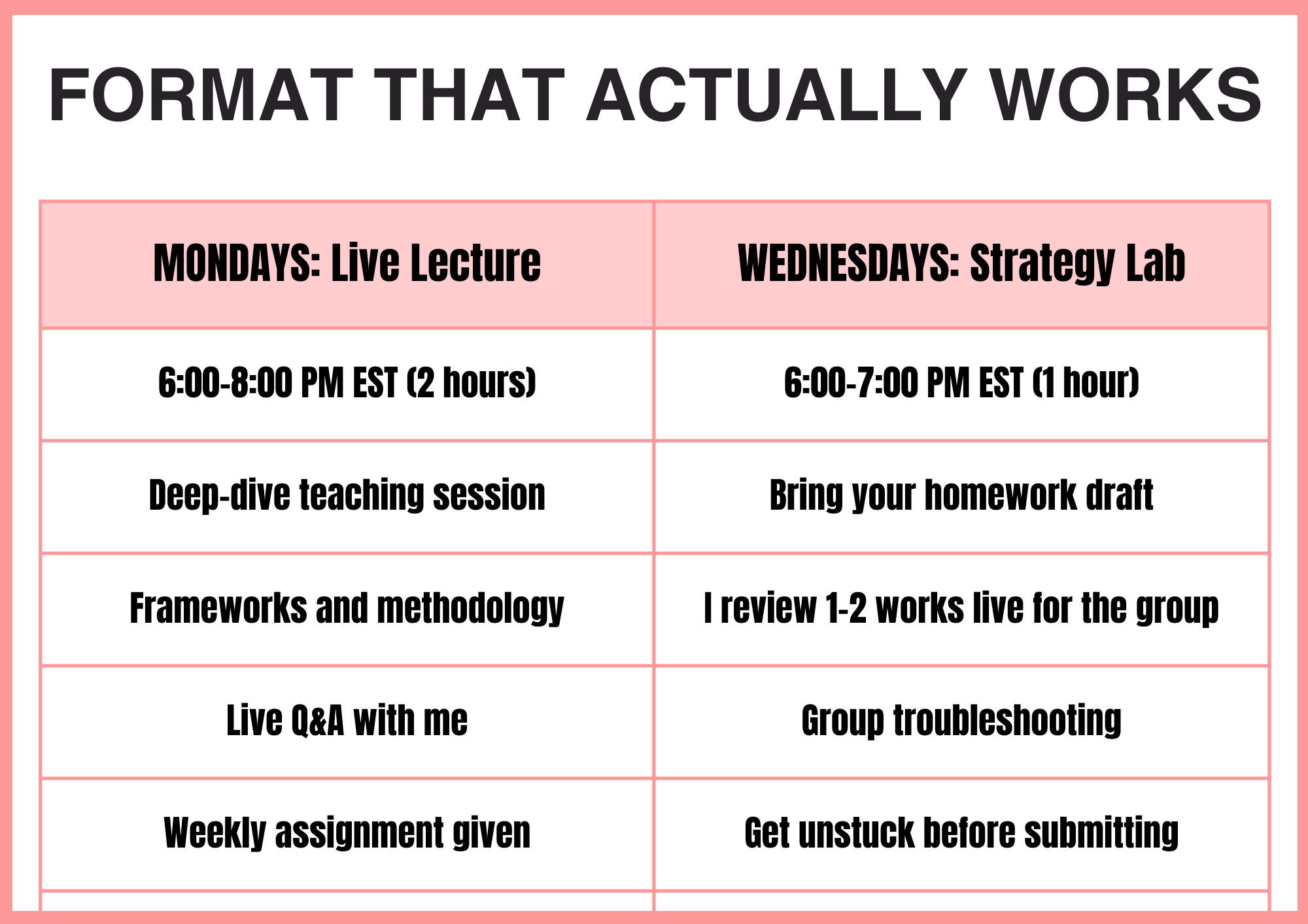 - 7 weeks of Strategy Labs (Wednesdays, 1 hour)